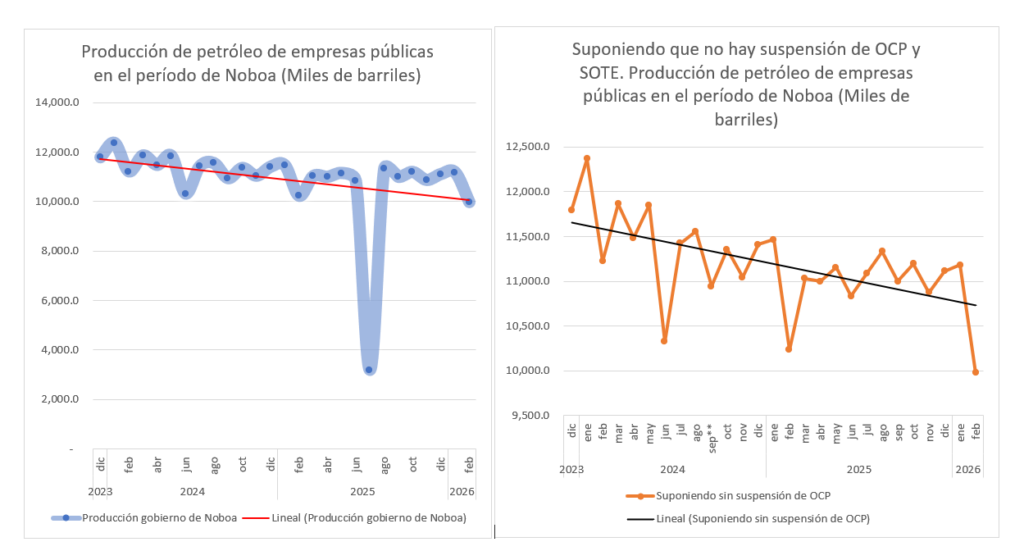 Ahora, la tendencia descendente de la producción petrolera es aún más clara en los datos oficiales del Banco Central del Ecuador. El primer gráfico muestra la producción real de las empresas públicas (principalmente Petroecuador) durante el período de Noboa: una curva con pendiente negativa que, incluso sin el colapso temporal de julio 2025, termina en niveles inferiores a los de diciembre 2023. El segundo gráfico presenta un escenario contrafactual (“suponiendo que no hubiera ocurrido la suspensión del OCP y SOTE”): la tendencia sigue siendo claramente a la baja, lo que confirma que el problema no se reduce al evento climático, sino que refleja un declive estructural persistente de los campos maduros y la falta de inversión.